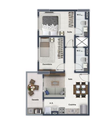 Apartamentos com 57,06m² úteis distribuídos em 2 Dormitórios sendo 1 Suíte, Sacada Gourmet, Sala, Cozinha, Área de Serviço e WC Social.