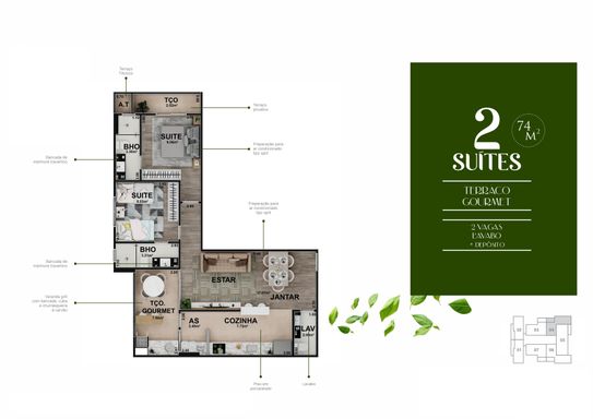 Apartamentos com 2 Dormitórios sendo 2 Suítes, Sacada Gourmet com Churrasqueira a Carvão, Sala 2 Ambientes, Cozinha Área de Serviço e Lavabo