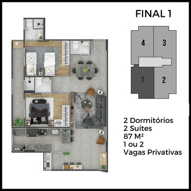 Apartamentos 2 Dormitórios sendo 2 Suítes, Sala Ampla Integrada com a Sacada Gourmet, Cozinha, Área de Serviço e Lavabo